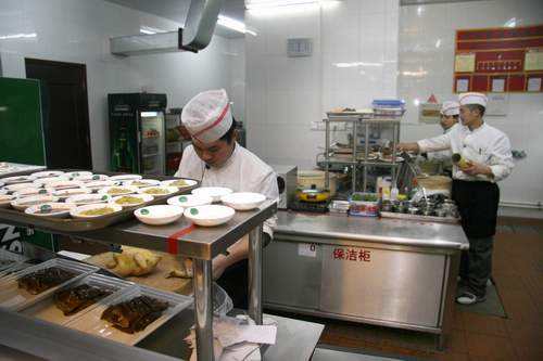 其次、冷菜间是冷菜成品切配装盆的场所,冷菜的制作应遵循“专人、专室、专用工具、专冷藏”的“五专”制度。