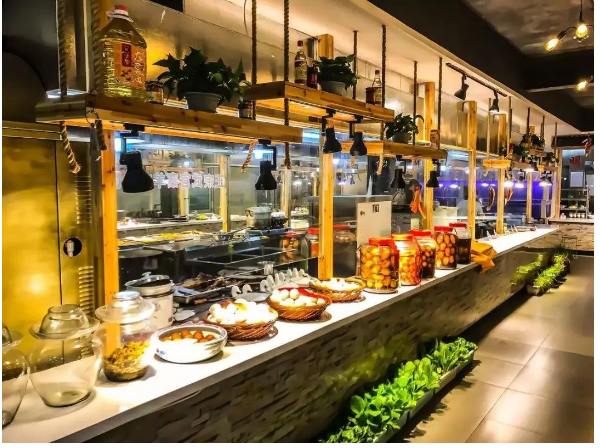蔬菜面体现的核心点,是“新鲜”二字。蔬菜要透亮,食材要有活力,蔬菜给顾客呈现的是新鲜感,而不是菜品本身。把蔬菜在明档中一穿插,整个明档就会活起来。蔬菜的展现形式,可以采用干冰雾化的方式,不求多,但求新鲜感和立体感;也可以用透明保险柜展示。蔬菜的摆放可以将颜色鲜艳的放置在一起,形成强烈的视觉冲击。