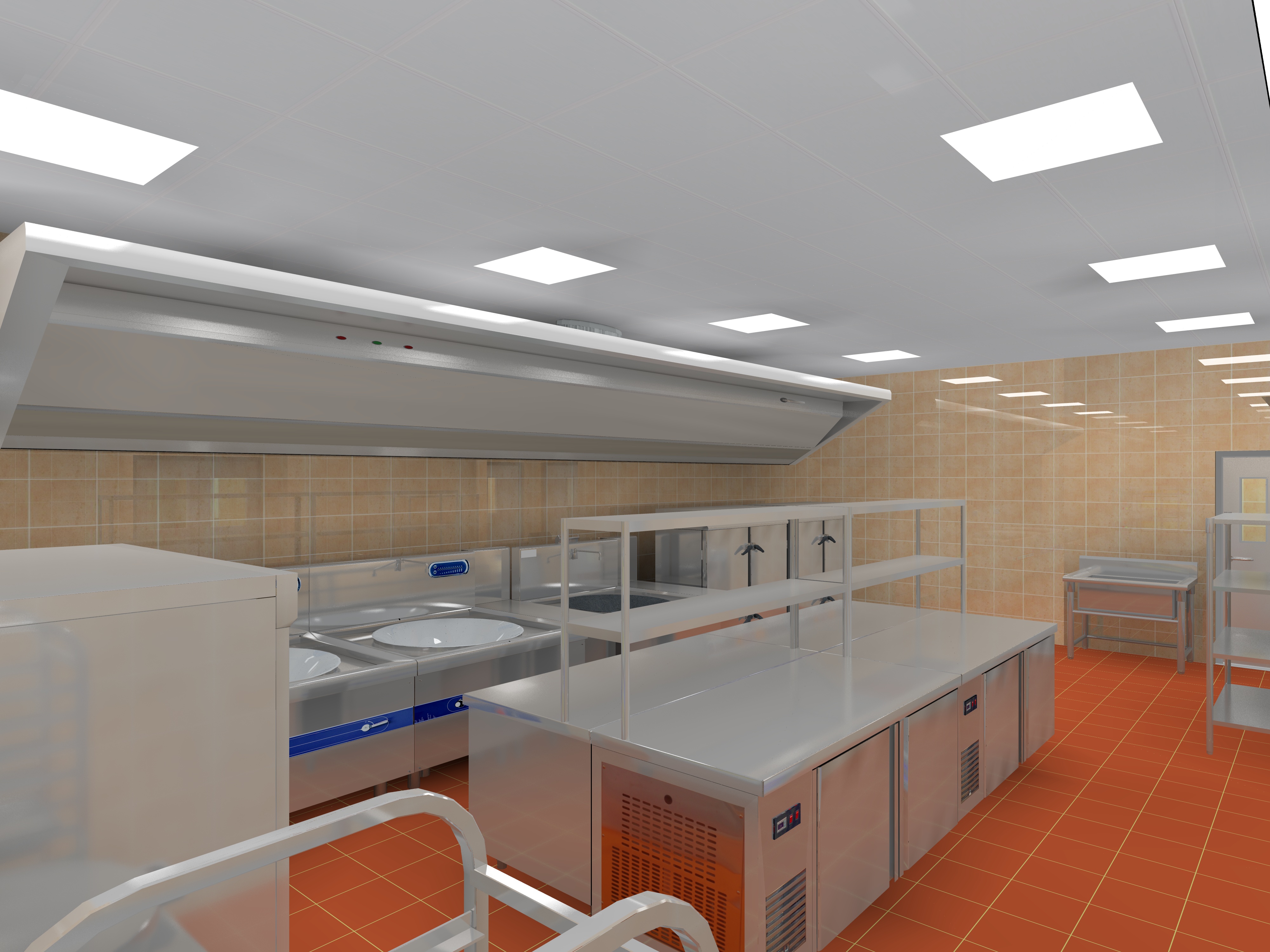在一般比较正规的商用日皮视频APP苹果下载内,为了保持清洁卫生,在主食加工间、凉菜间设计了隔断,凉菜间设计了凉菜出餐口,便于出餐。凉菜间的隔断既能阻挡油烟废气,也隔断了从凉菜出餐口向内观望的视线。洗消间和传菜间采用无墙隔断,功能区域分隔要清楚,便于配置工作,以满足经营者的要求。