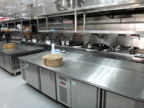 3、储藏设备:其分为食品储藏部分,包括常温和低温设备:平板货架、米面柜、打荷台冰箱、冰柜、冷库等,器物用品储藏部分调料柜、售卖工作台、各种底柜、吊柜、角柜、多功能装饰柜等。