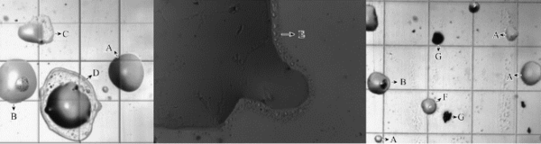如图所示,油烟颗粒物主要有常规液态油粒(A)、油包食材渣(B)、油水混合(C)、水包油(D)、油包水(F)等,除此之外还有固态颗粒(G)等形态。
