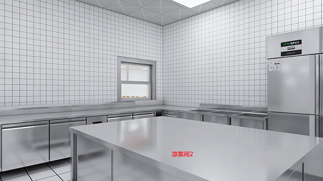 该工作区域负责凉菜熟制、改刀装盘、水果盘的切制装配及出品等工作。为保证成品质量、防止凉菜切配受污染变质,应保持室内高度洁净和低温环境。档次较高的饭店,凉菜间设洗手更衣的预进间和出餐口。为保证凉菜间的低温洁净,凉菜的熟制应该在另设的加工间内进行。凉菜熟制需要炒灶、汤灶等炉具;凉菜改刀装盘还需要配置工作台、保鲜工作台、拉门工作台、冰柜、货架、货柜、碗柜、水果保鲜柜、制冰机、碎冰机等。