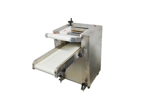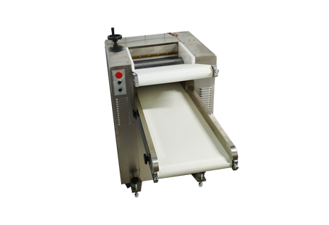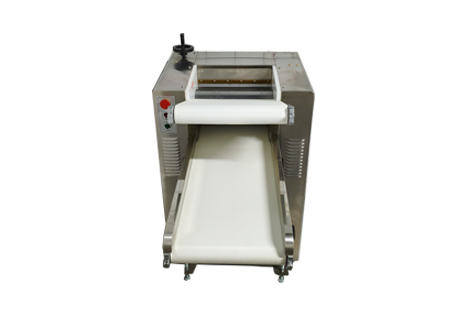 1.将定量面团放在下输送带上,开动机器,自动输送到轧辊间,面团在输送带和轧辊作用下自动完成喂入和压面过程。